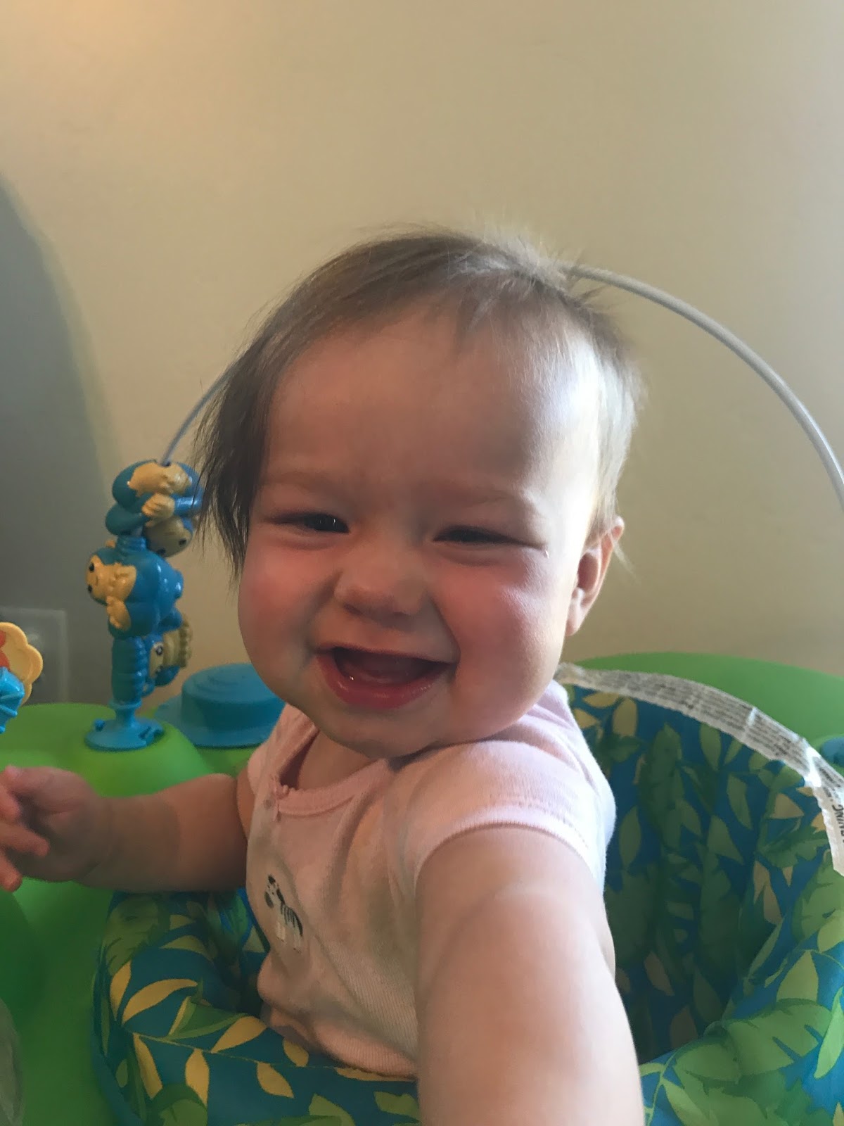 I feel like your personality really exploded this month. I've always felt like you have a personality, but I guess it just gets bigger and bigger as you do 😊 You have become quite the busy-body this month, too. You're still not crawling, but every time I turn around, you've managed to move a good distance to get to something you shouldn't be playing with. You never hold still -- you're always looking all around, most of all if someone is holding you. Idk if it's just because you're a baby or if it's because you are your daddy's daughter, but you are one curious girl :) I sure love you!