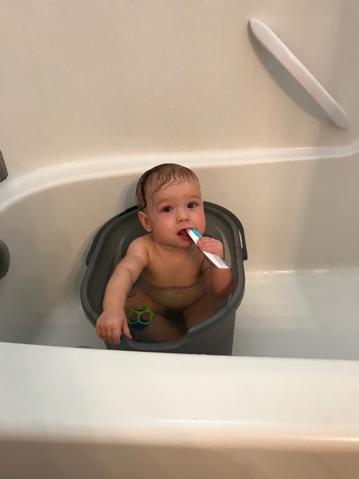 - I finally found a way to successfully shower with you! But which won't last much longer, unfortunately. I tried just putting you in the tub, plugging the stop, and letting the shower water fill the tub, but I discovered that even when the water was really hot for me, it was cold by the time it got to you, so you were freezing! My solution is to fill a bucket with warm water and just put you in that at the end of the tub :) It worked really well the first time I tried it, but you're already getting too strong and trying to get out of the bucket.